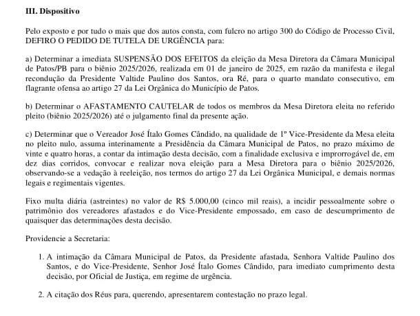 Na decisão, a juíza também determinou que o vereador Ítalo Gomes, na condição de primeiro vice-presidente da mesa anulada, assuma interinamente a presidência da Câmara Municipal de Patos. Ele deverá, no prazo máximo de 24 horas após a intimação, assumir o cargo e, em até dez dias corridos, convocar e realizar uma nova eleição para a Mesa Diretora do biênio 2025/2026.