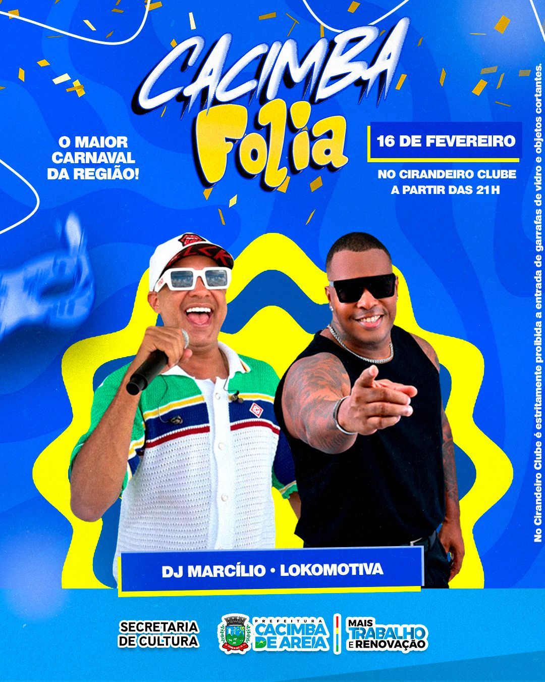 A prefeitura de Cacimba de Areia-PB, divulgou nesta quarta-feira (28), a programação do Cacimba Folia 2026, o tradicional carnaval da cidade. Com o abertura programada para o dia 14 de fevereiro até o dia 17, grandes atrações, manifestações culturais, desfile de blocos, apresentações de trupes e shows no Cirandeiro e pelas ruas, estão na programação do evento deste ano.