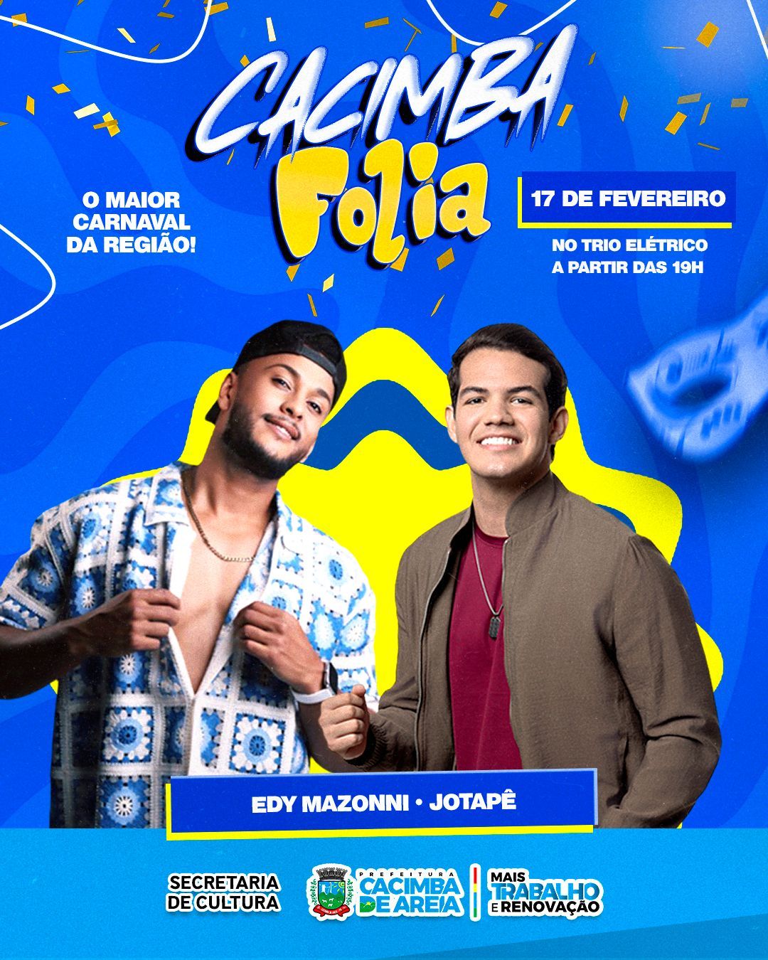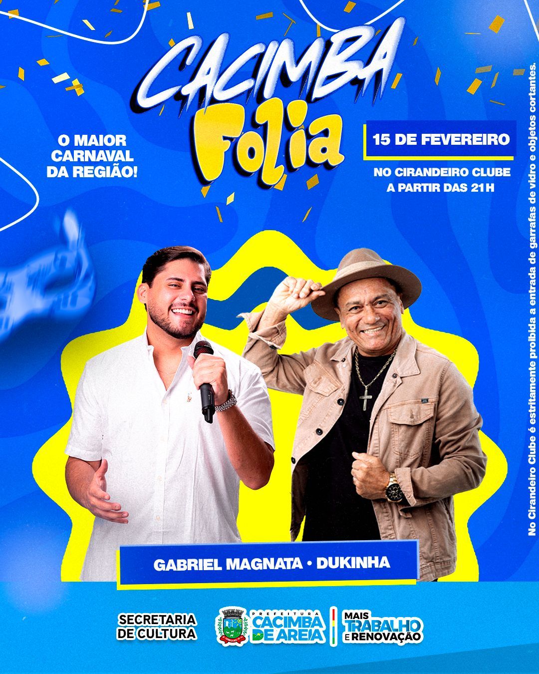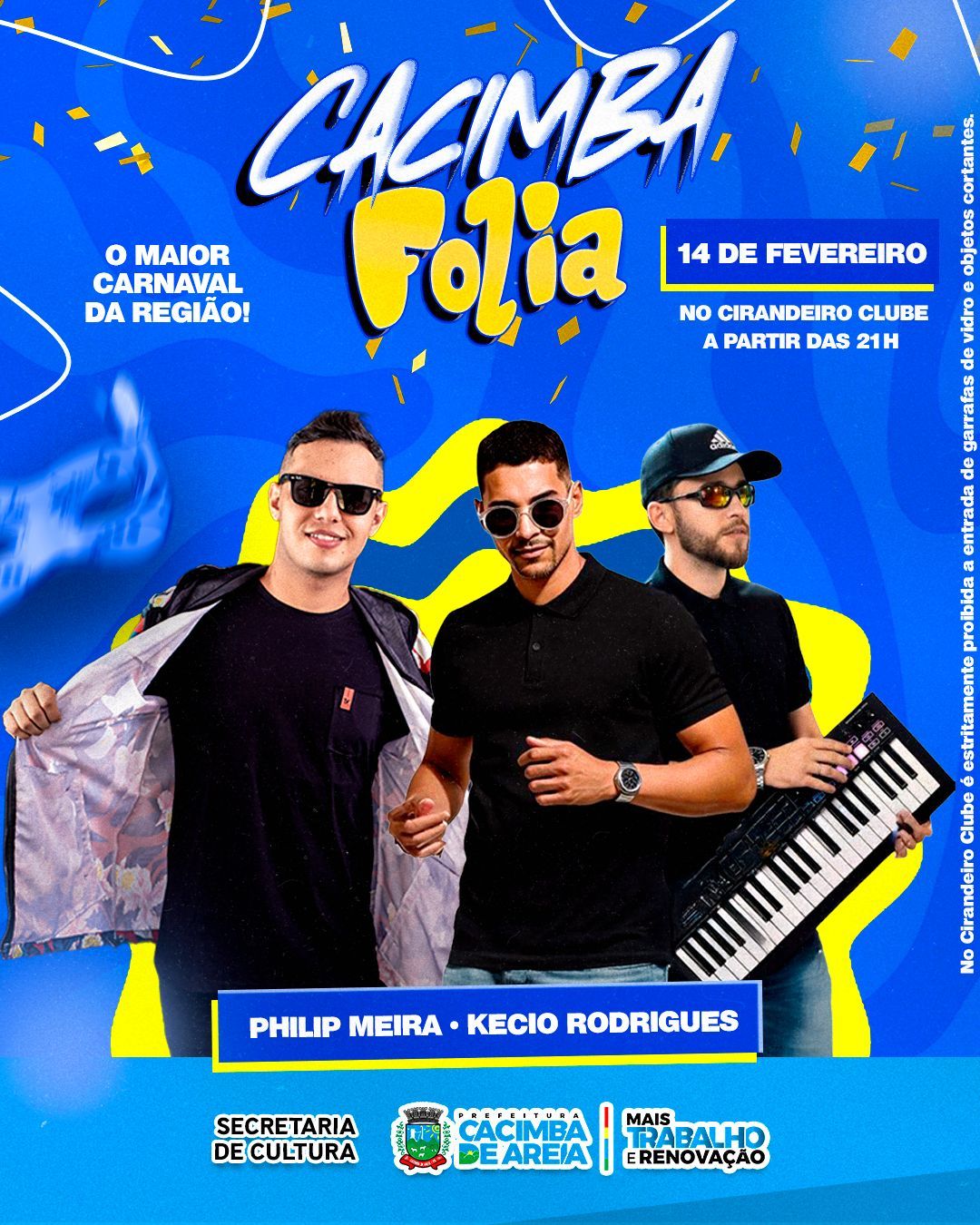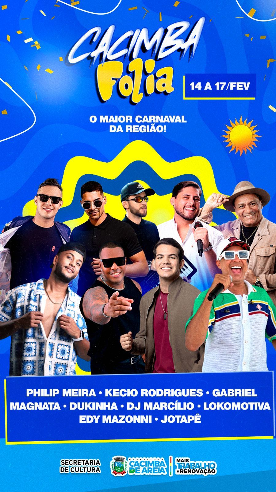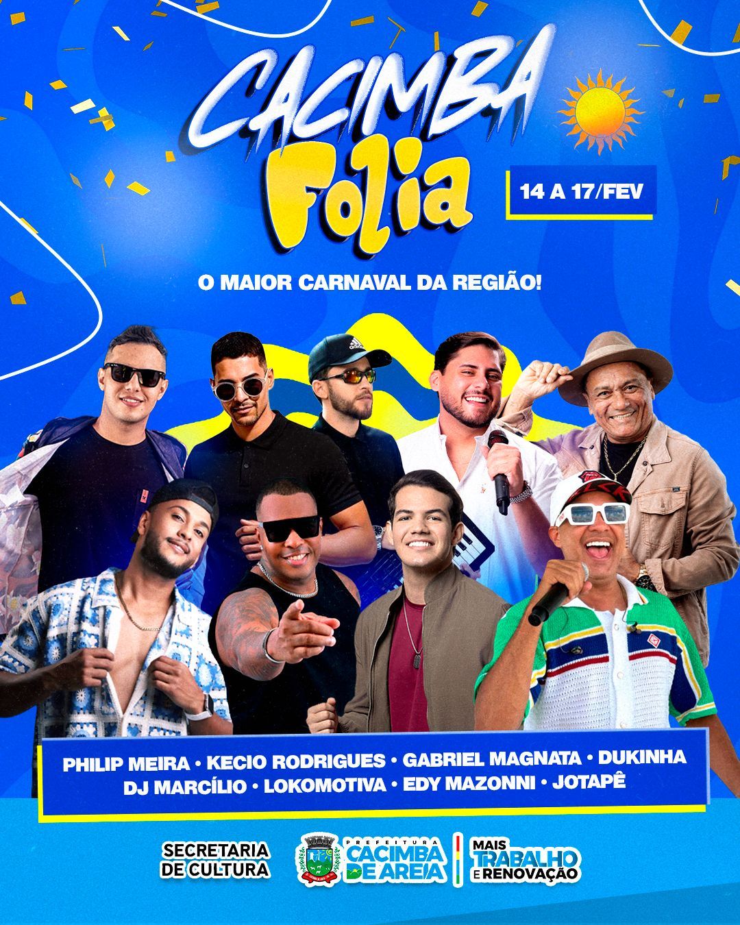 No comando da festa, grandes atrações vão garantir os quatro dias do Cacimba Folia: Philip Meira, Kecio Rodrigues, Gabriel Magnata, Dukinha, DJ Marcílio, Lokomotiva, Edy Mazonni e Jotapê.