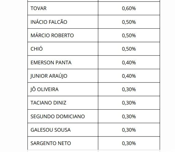 O levantamento também aponta os 14 nomes que figurariam como suplentes, caso o cenário se confirmasse. São eles: Tovar Correia Lima, Inácio Falcão, Márcio Roberto, Chió, Emerson Panta, Júnior Araújo, Jô Oliveira, Taciano Diniz, Segundo Domiciano, Galego Souza, Sargento Neto, Marcos Eron, Fábio Ramalho e Zezé.