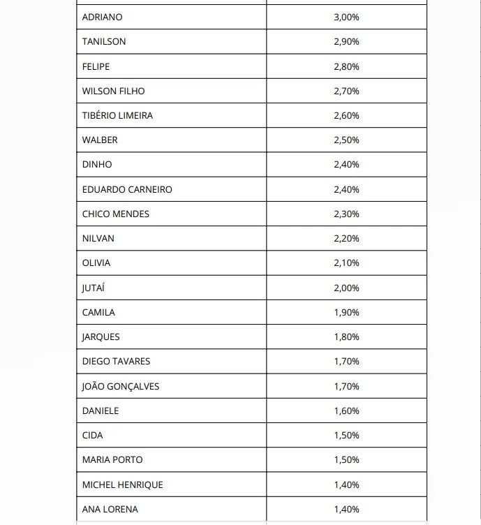 De acordo com a pesquisa, Cicinho Lima aparece em posição competitiva, ocupando a 26ª colocação em um cenário que considera as 36 vagas da Assembleia Legislativa. O desempenho o coloca entre os nomes que avançam de forma consistente no levantamento.