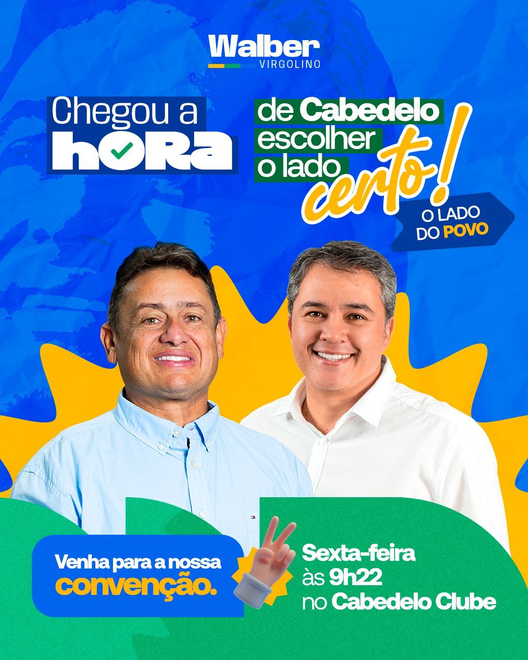 A coordenação da pré-campanha de Walber Virgolino convida os veículos de comunicação para a cobertura da Convenção Partidária que oficializará sua candidatura à Prefeitura de Cabedelo.