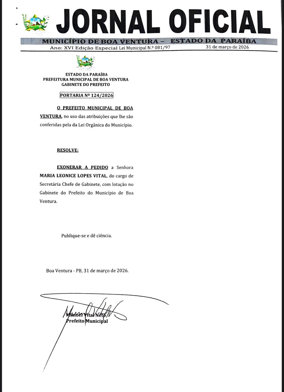 A Prefeitura de Boa Ventura oficializou a exoneração da secretária-chefe de Gabinete, Leonice Lopes. A medida foi publicada no Jornal Oficial do Município por meio da Portaria nº 124/2026, assinada pelo prefeito Vital Neto, com data de 31 de março de 2026.