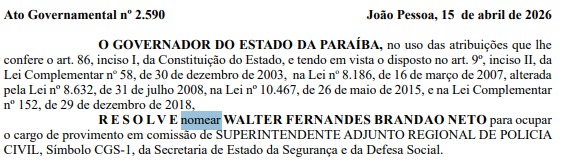 O governador Lucas Ribeiro oficializou mais uma mudança na estrutura da Segurança Pública da Paraíba. Conforme publicação no Diário Oficial desta quinta-feira (16), o delegado Walter Fernandes Brandão Neto foi nomeado para o cargo de superintendente adjunto regional da Polícia Civil.
