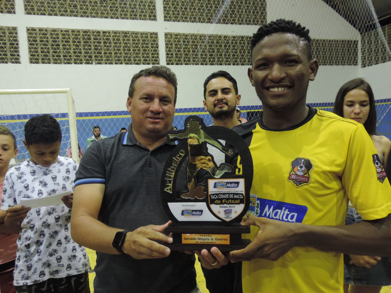 Joilma viúva de Geraldo e seu filho Juninho entregaram o troféu de campeão da competição ao capitão da equipe do Magnus campeão da competição que receberam a premiação de oitocentos reais.
