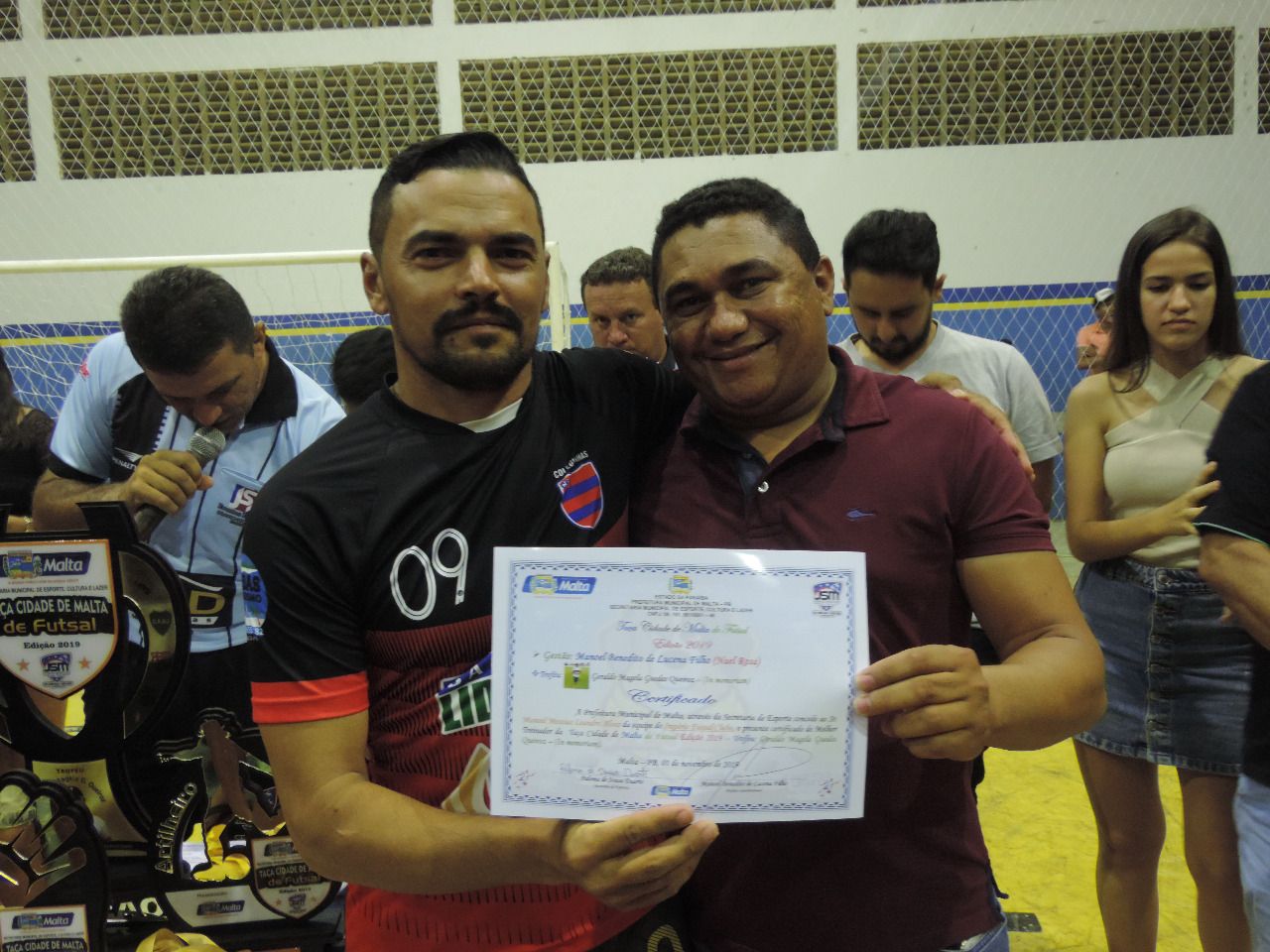 A Secretaria Municipal de Esportes, cultura e Lazer com o apoio da Prefeitura Municipal de Malta, realizou na noite desta Sexta - Feira (01) às 19hs30mm no Ginásio de Esportes Edvaldo Motta, a grande final da Taça Cidade de Malta de Futsal, estiveram presentes: Os Secretários: Zé Duarte, (Esportes) Naedy ( Finanças) Igor Rosa ( Assistência Social) Luiz Almeida (presidente).
