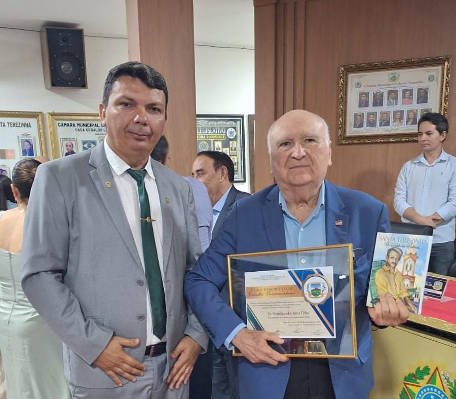 O conselheiro do Tribunal de Contas, Nominando Diniz, participou de uma sessão solene realizada nesta semana na Câmara Municipal de Santa Terezinha, onde recebeu o título de cidadão santerezinhense. A homenagem reconhece a trajetória e os serviços prestados pelo conselheiro, que agora passa a integrar oficialmente o quadro de cidadãos do município.