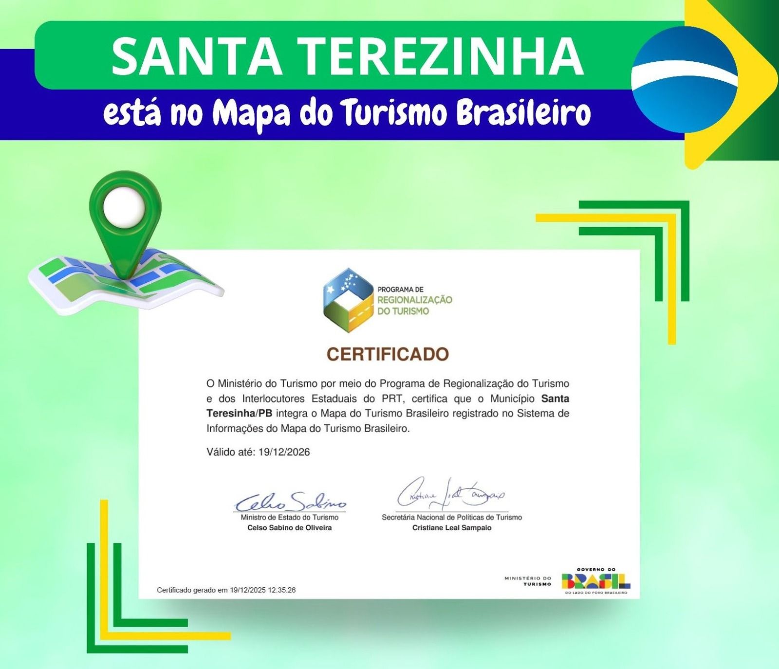 O município e o Conselho Municipal de Turismo estão certificados no Mapa do Turismo Brasileiro, conforme o Sistema de Informações Turísticas do Ministério do Turismo — uma conquista que fortalece a identidade cultural e abre portas para mais desenvolvimento!