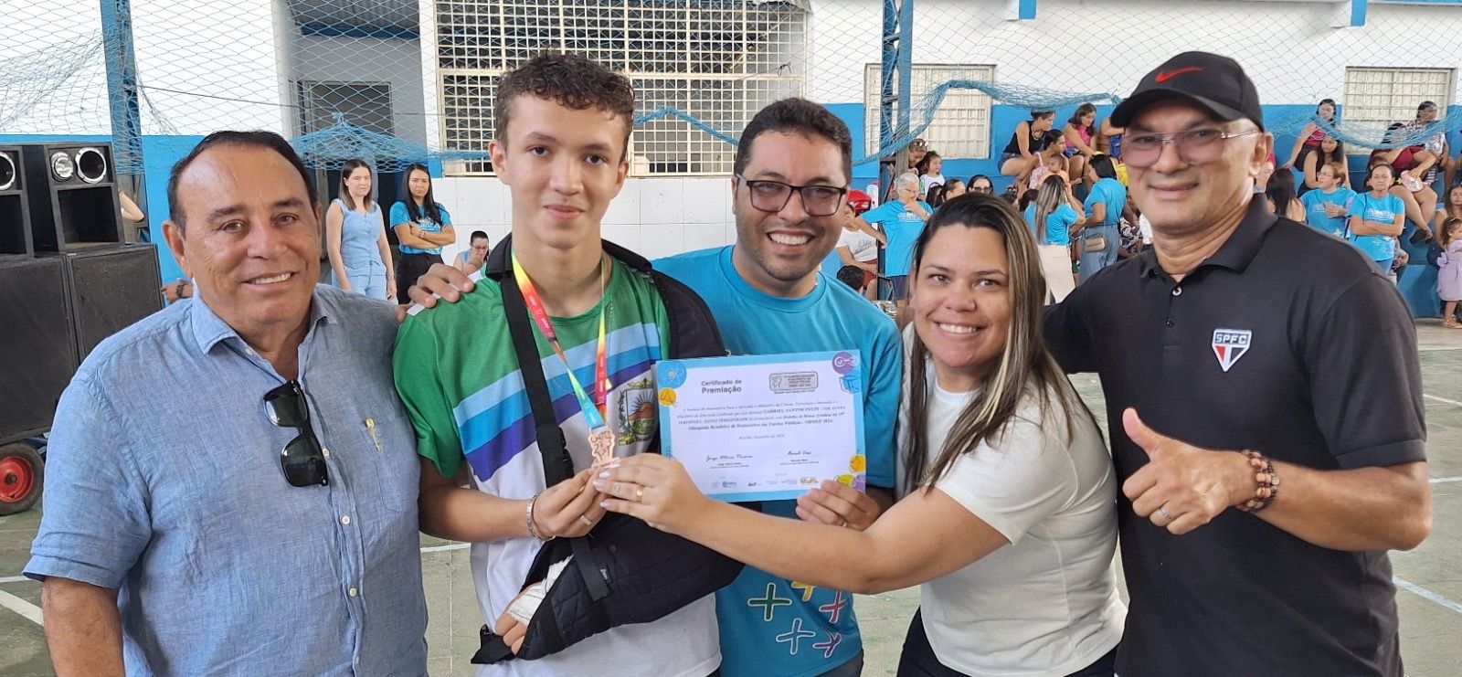 A medalha e o Certificado de Premiação chegaram à instituição de ensino neste mês e foram entregues ao estudante pelo prefeito constitucional, Arimatéia Camboim, em 16 de março, durante a Abertura da Semana do Dia A de Alfabetização e na oportunidade foram celebradas outras conquistas pela Secretaria Municipal de Educação. O momento foi alegria foi compartilhado pelos familiares de Gabriel, professores, estudantes, gestores escolares, equipes da Secretaria de Educação e comunidade.