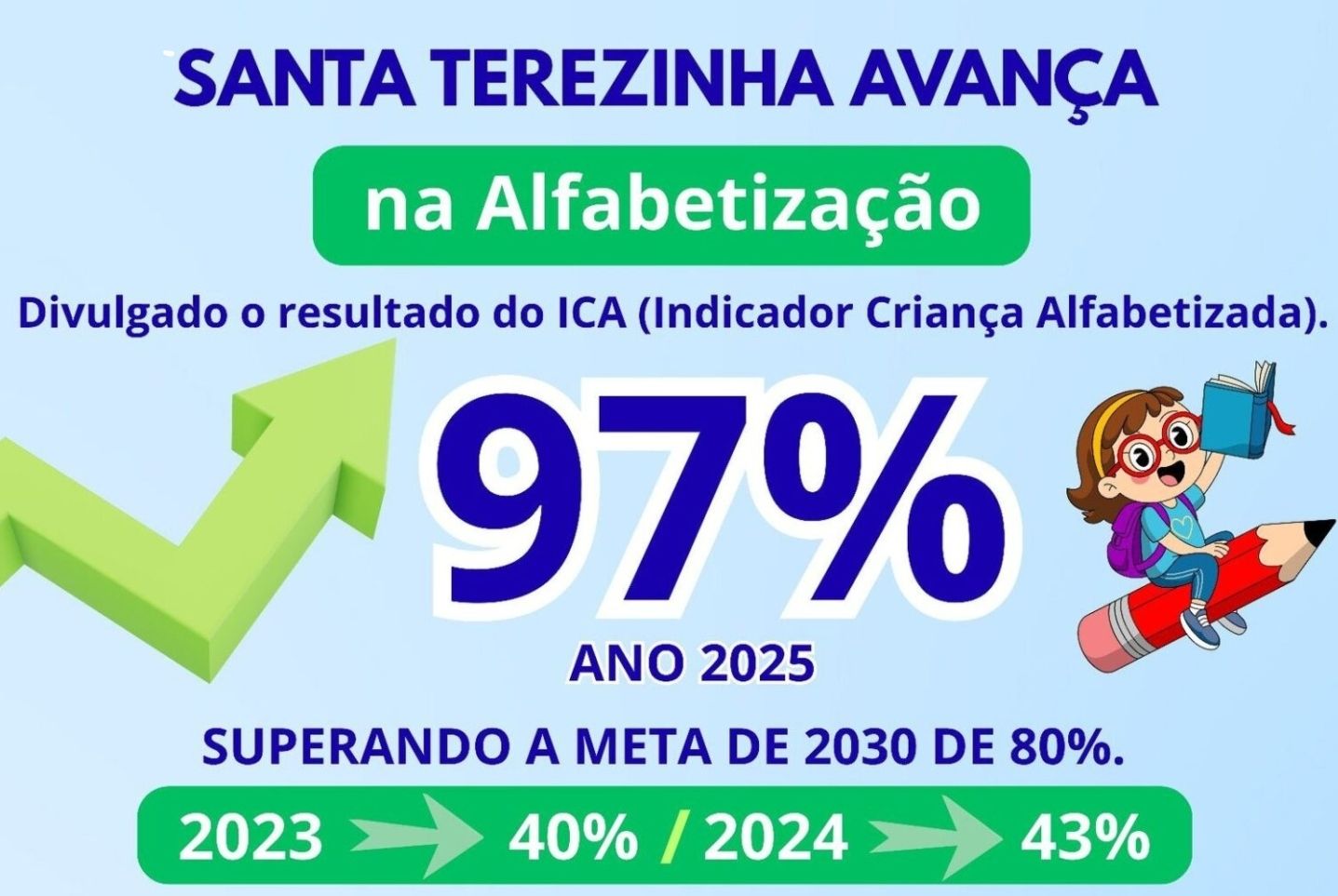 “Com alegria e gratidão, celebramos esse grande resultado do Indicador Criança Alfabetizada ICA de Santa Teresinha. Saímos de 40% em 2023 para 97% das crianças alfabetizadas em 2025, superando a meta estabelecida para nosso município para o ano de 2030! Isso só fortalece nossos esforços e reafirma o compromisso de toda a equipe com a alfabetização de todas as crianças na idade certa. É hora de comemorar, mas também de seguirmos firmes realizando o nosso trabalho com responsabilidade e empenho dobrados para que este resultado siga em ascensão”, enfatizou.