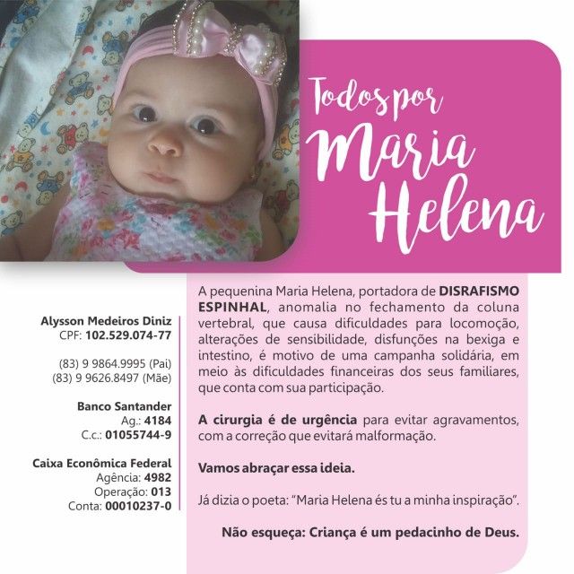 Os familiares da pequena Maria Helena Ferreira Diniz, de apenas quatro meses, estão realizando uma campanha para que a criança possa realizar...