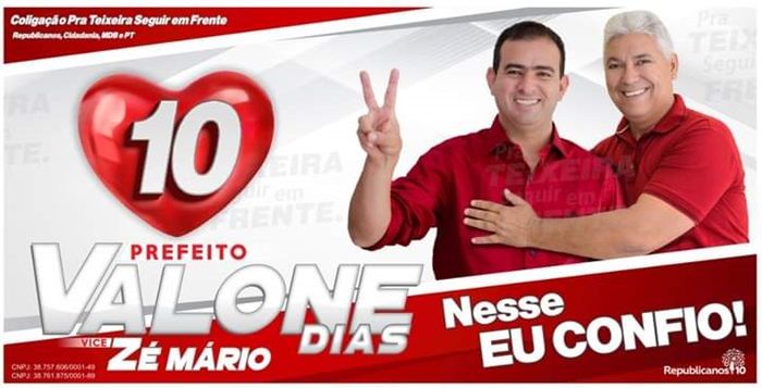 A coligação: “Pra Teixeira Seguir em Frente”, comandada pelo candidato a prefeito de Teixeira, Valone Dias (Republicanos) e seu vice,...